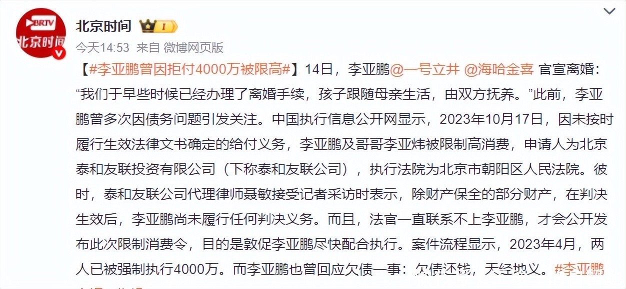 据媒体公开报道,李亚鹏曾在半年内创下直播带货2亿的销售额,但即使李亚鹏因此获得了不斐的收益,但对于他的债务而言,这也只是杯水车薪。